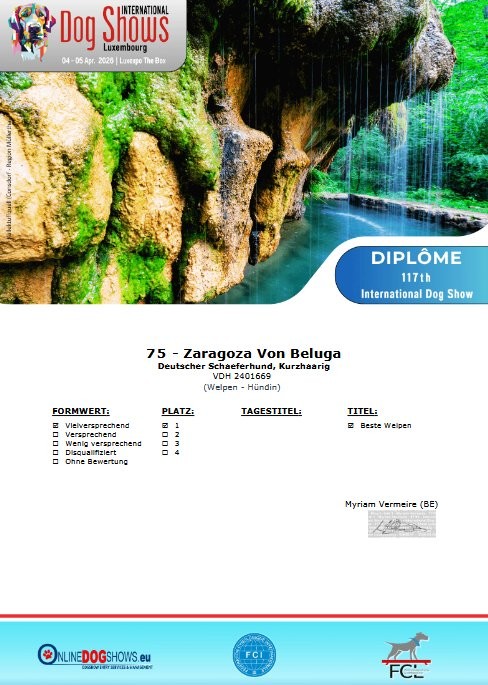 Am 05.04.26 sollte klein Zaragoza das erste Mal an einer Ausstellung teilnehmen. Also sind wir nach Luxemburg aufgebrochen, natürlich begleitet von unserer Freundin Barbara. Im Ausland dürfen Hunde schon mit 6 Monaten starten und das sollte für unser Mädel ein Trainingstag werden. Zu der Veranstaltung waren insgesamt 27 Deutsche Schäferhunde aus verschiedenen Ländern gemeldet. Zaragoza startete in der Minor Puppy Class und gerichtet hat die Richterin Myriam Vermeire aus Belgien.